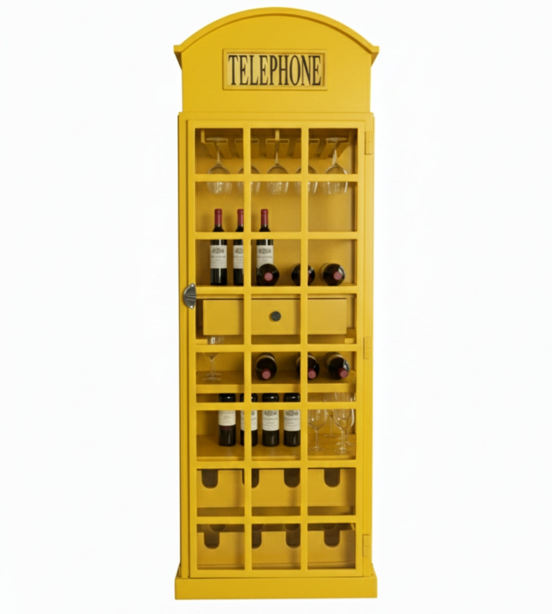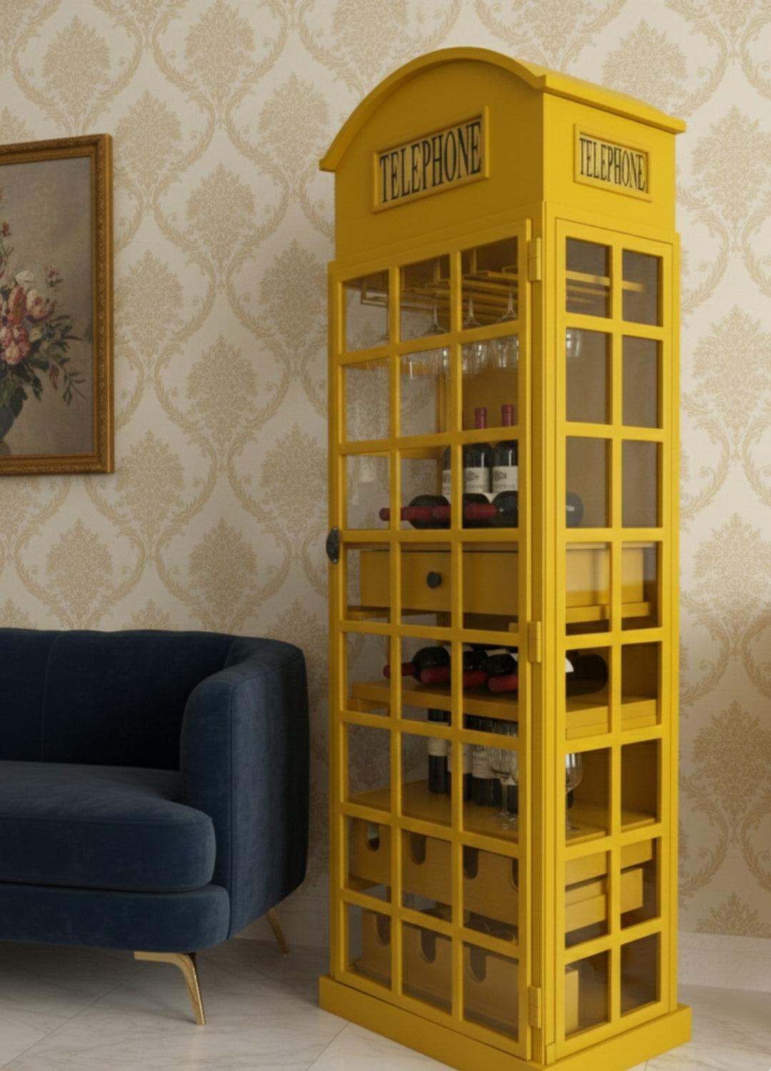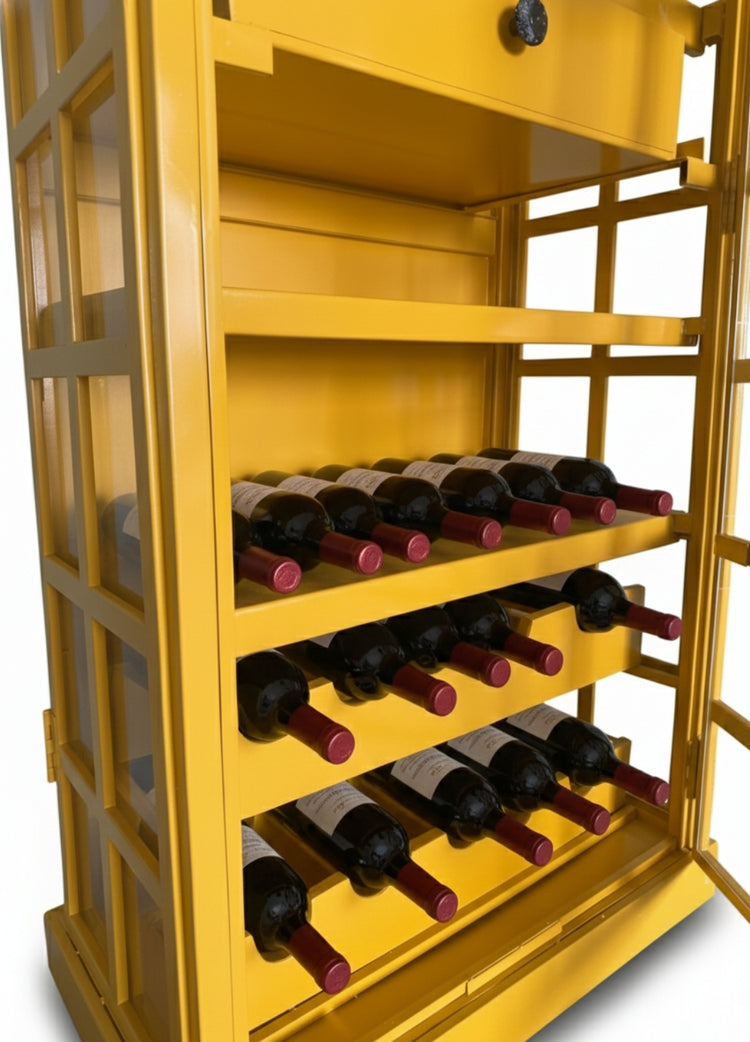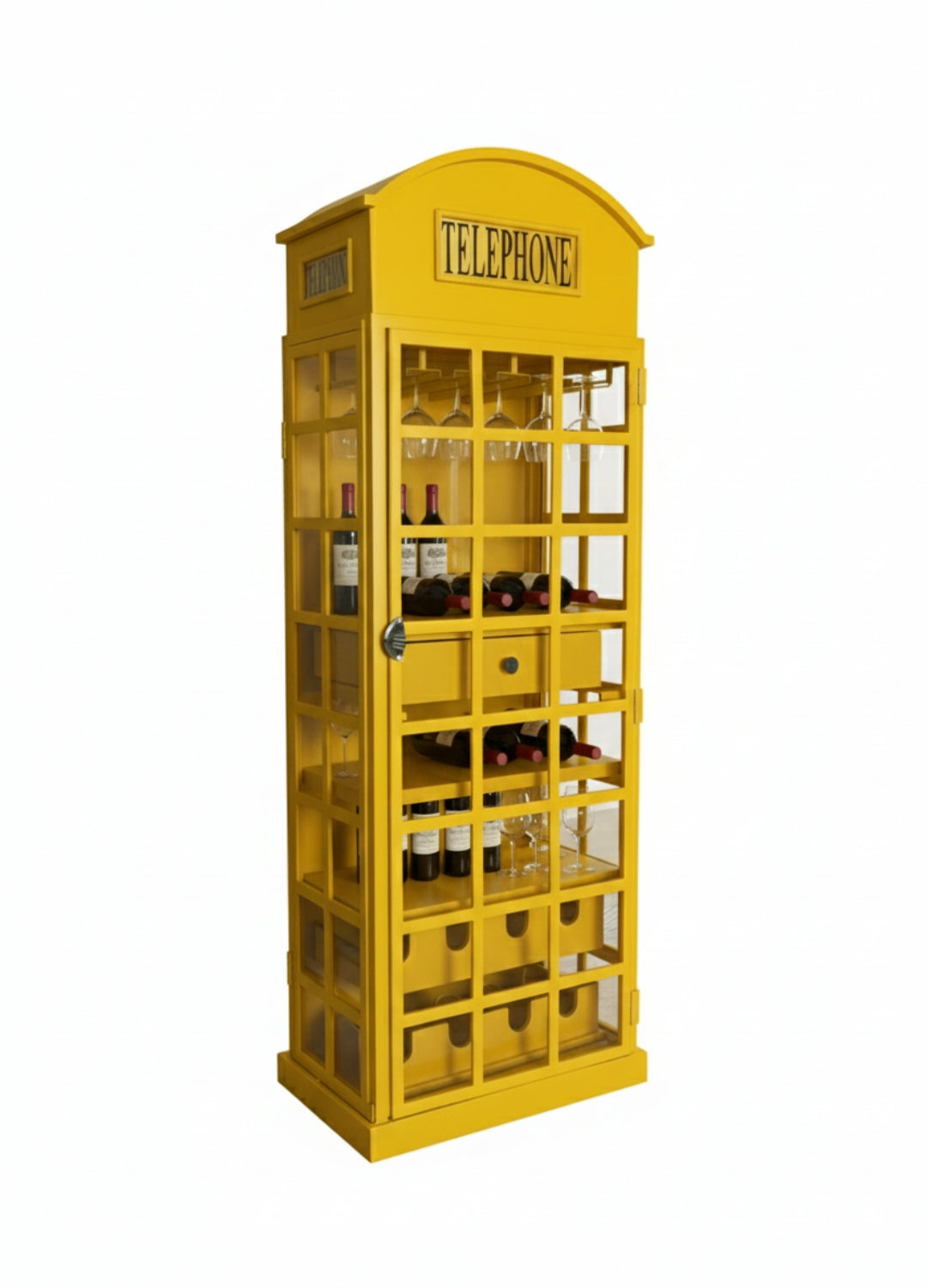 Bring a piece of British heritage into your home with the Classic Telephone Booth Bar Cabinet, a stunning furniture piece inspired by the iconic yellow British telephone box. Designed to blend vintage elegance with modern functionality, this bar cabinet is the perfect addition for wine lovers, entertainers, and anyone with an eye for distinctive décor.