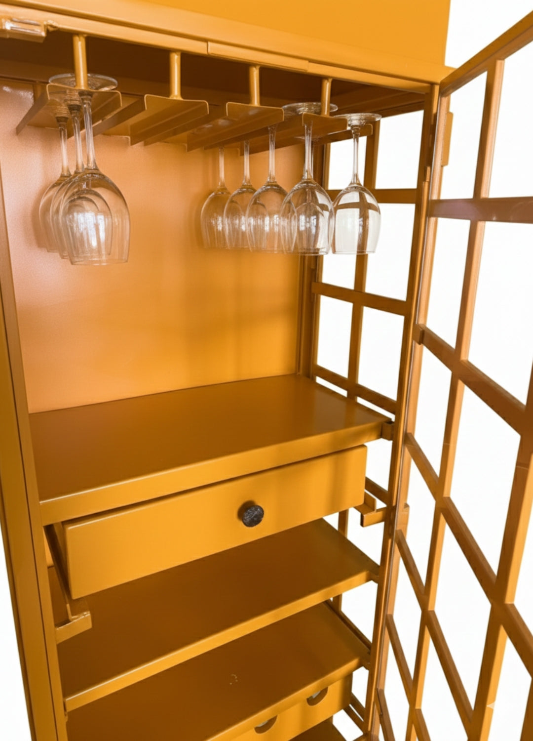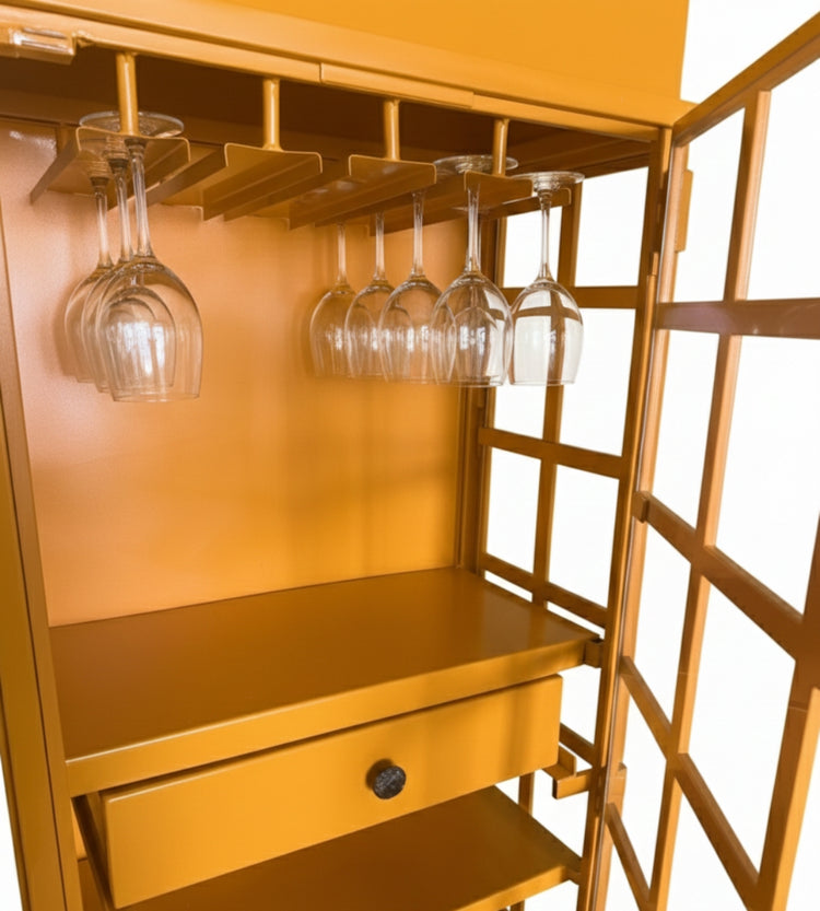 Crafted from premium metal with a durable painted finish, it features multiple shelves, a glass rack, and spacious compartments for neatly organizing wine bottles, liquor, and bar accessories. Its eye-catching design makes it not only a practical storage unit but also a statement piece that enhances the ambiance of any living room, home bar, or restaurant.