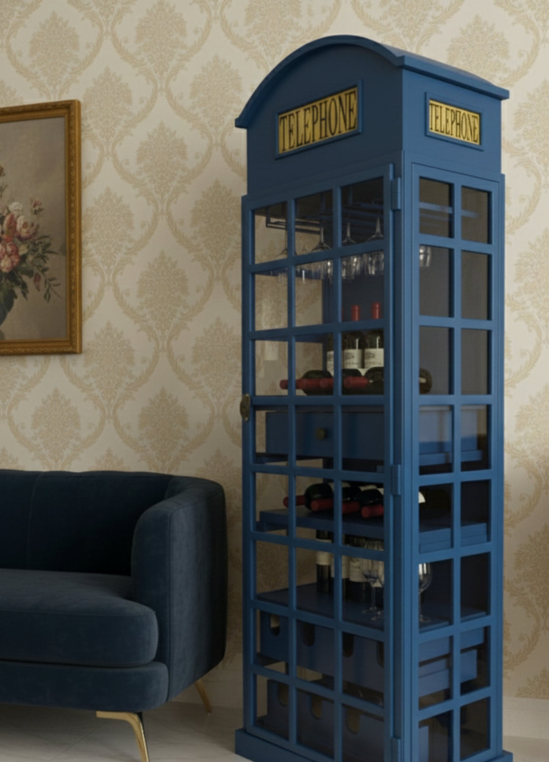 Bring a piece of British heritage into your home with the Classic Telephone Booth Bar Cabinet, a stunning furniture piece inspired by the iconic blue British telephone box. Designed to blend vintage elegance with modern functionality, this bar cabinet is the perfect addition for wine lovers, entertainers, and anyone with an eye for distinctive décor.