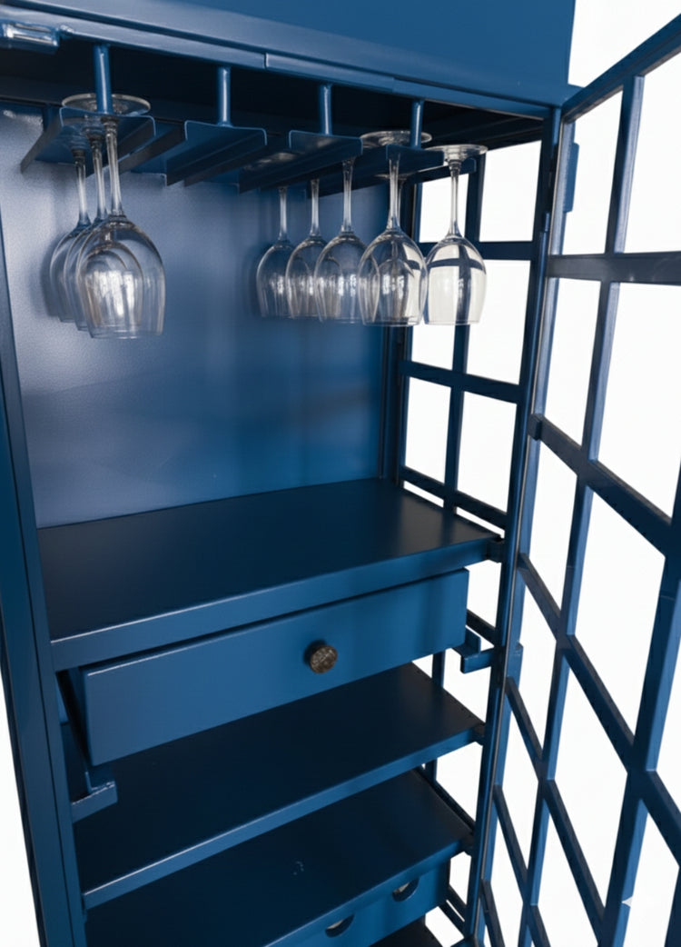 Crafted from premium metal with a durable painted finish, it features multiple shelves, a glass rack, and spacious compartments for neatly organizing wine bottles, liquor, and bar accessories. Its eye-catching design makes it not only a practical storage unit but also a statement piece that enhances the ambiance of any living room, home bar, or restaurant.