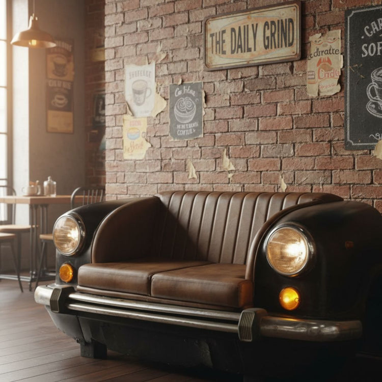 Transform your space with this Vintage Car Front Sofa, an extraordinary blend of classic automotive design and luxurious modern craftsmanship. Built from the authentic front end of a retro vehicle, this piece combines the bold presence of a deep black metal body with the warmth and richness of distressed brown leather upholstery.