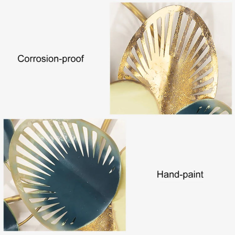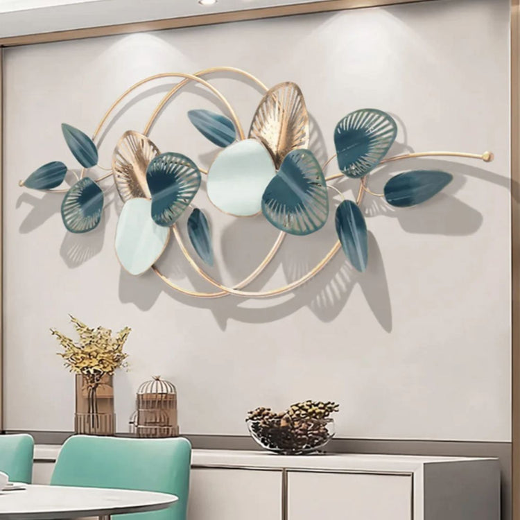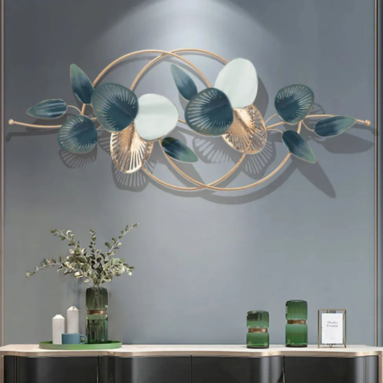 The rings' clean lines and minimalist design provide a sleek backdrop for the delicate leaves, which appear to dance across the metal surface. The contrast between the smooth rings and textured leaves adds depth and visual interest, making this piece a perfect addition to any room.