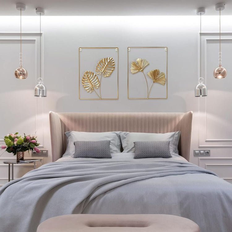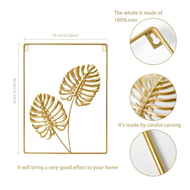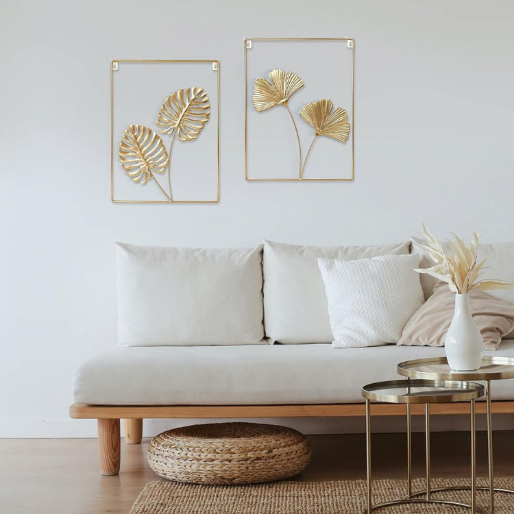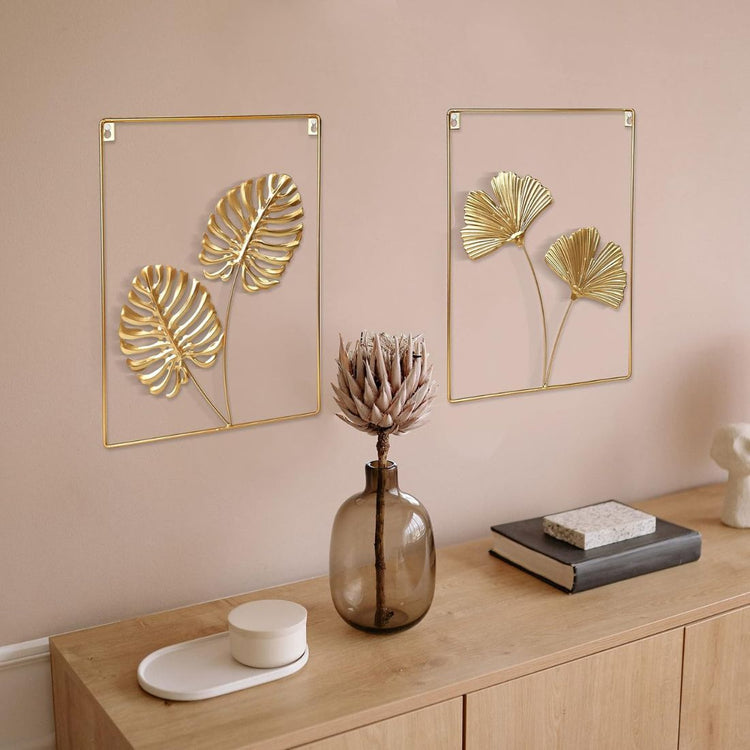 Hang these two pieces side by side or separately to create a sense of balance and harmony in your home or office. Perfect for adding a touch of natural elegance to any room, this set of golden leaves frames metal wall art is sure to impress.