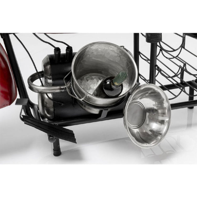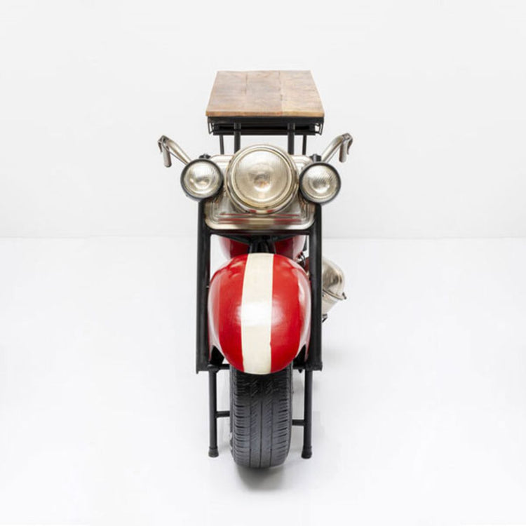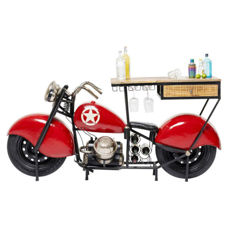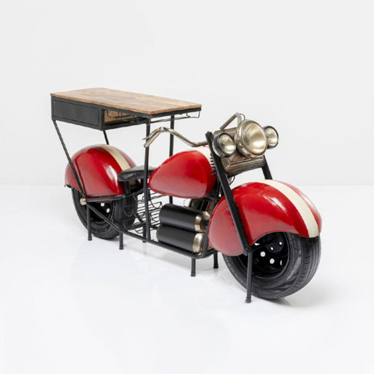 The durable wooden tabletop provides ample space for mixing drinks, serving snacks, or displaying bar décor. Beneath, a built-in storage drawer keeps bar essentials organized, while the hanging glass rack holds stemmed glasses securely and conveniently. Crafted with a sturdy metal frame and realistic bike details—complete with wheels, handlebars, and headlights—this table is both a functional bar solution and a striking decorative piece for any lounge or themed space.