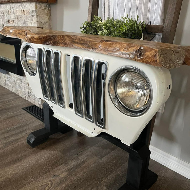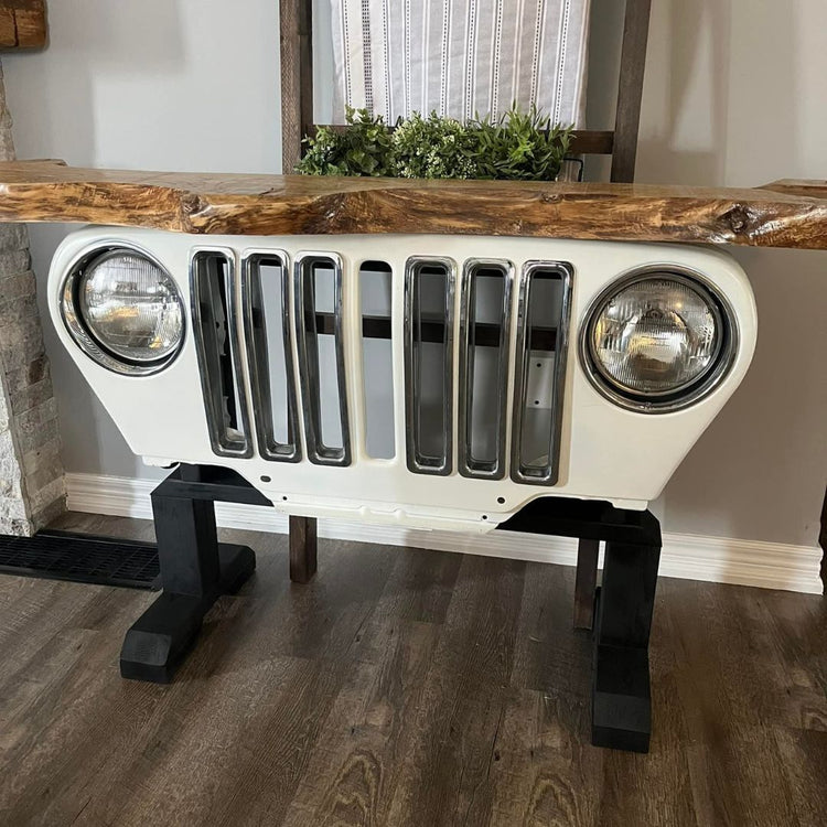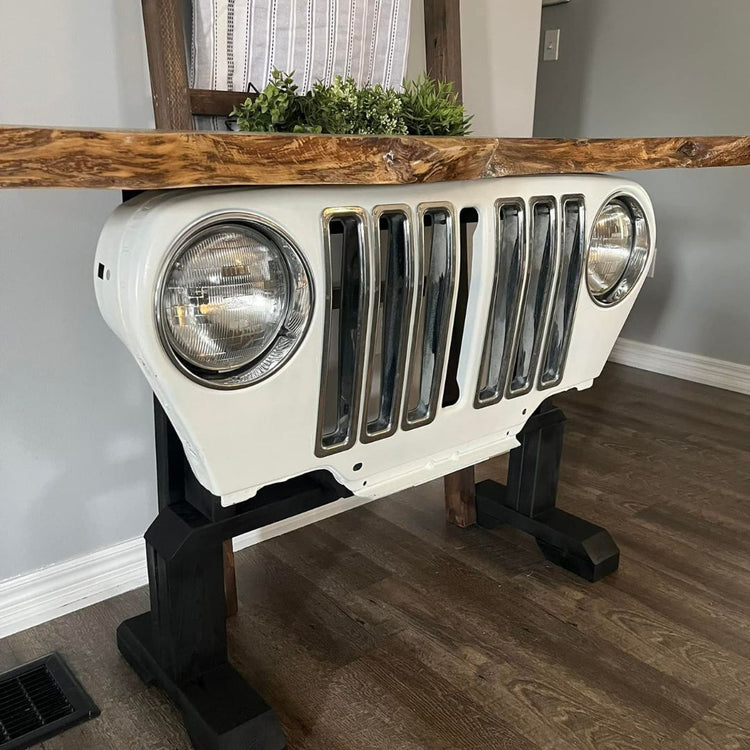 Elevate your interiors with the Antique White Jeep Grille Table, a striking fusion of rugged automotive heritage and rustic elegance. Handcrafted from an authentic vintage Jeep front grille, this one-of-a-kind table is enhanced with polished chrome inserts that add a sleek, high-end touch. The live-edge wooden tabletop highlights natural grain patterns, creating warmth and character that beautifully balances the bold, industrial aesthetic.