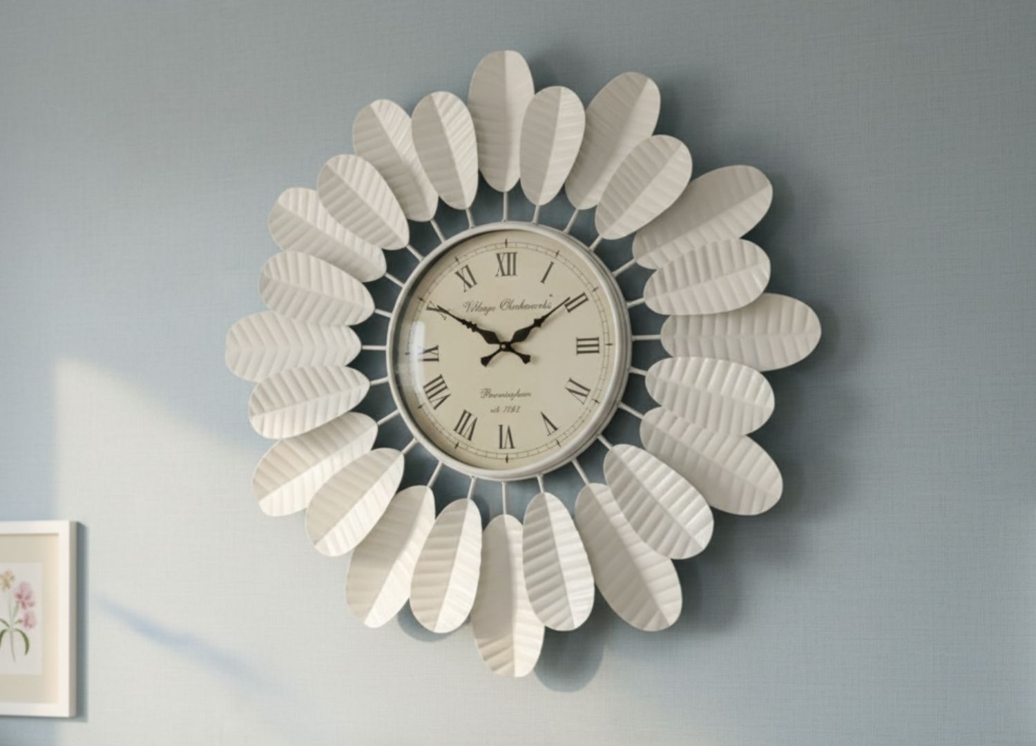 Large White Metal Floral Wall Clock Roman Numerals Decor